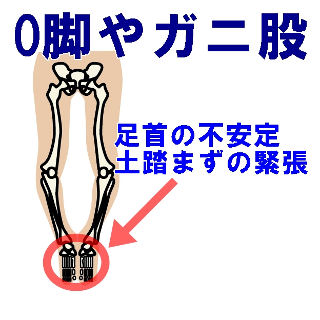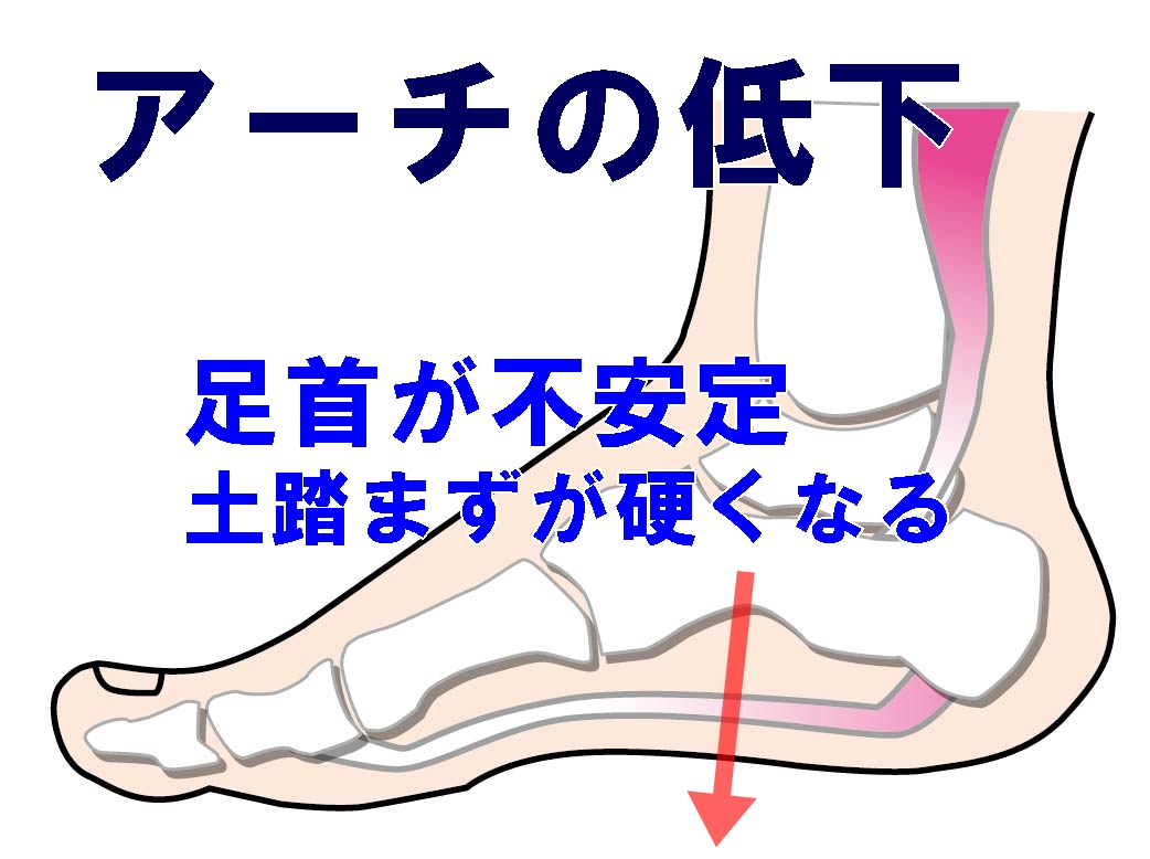 このガニ股で歩いていると、足首が必要以上に内側に倒れてしまいます。その結果、土踏まずがつぶれてしまい、アーチ構造が崩れてしまうのです。