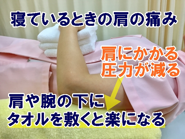 肩の下にタオルを敷くことで、このこわばりが解消できて、痛みの軽減ができます。